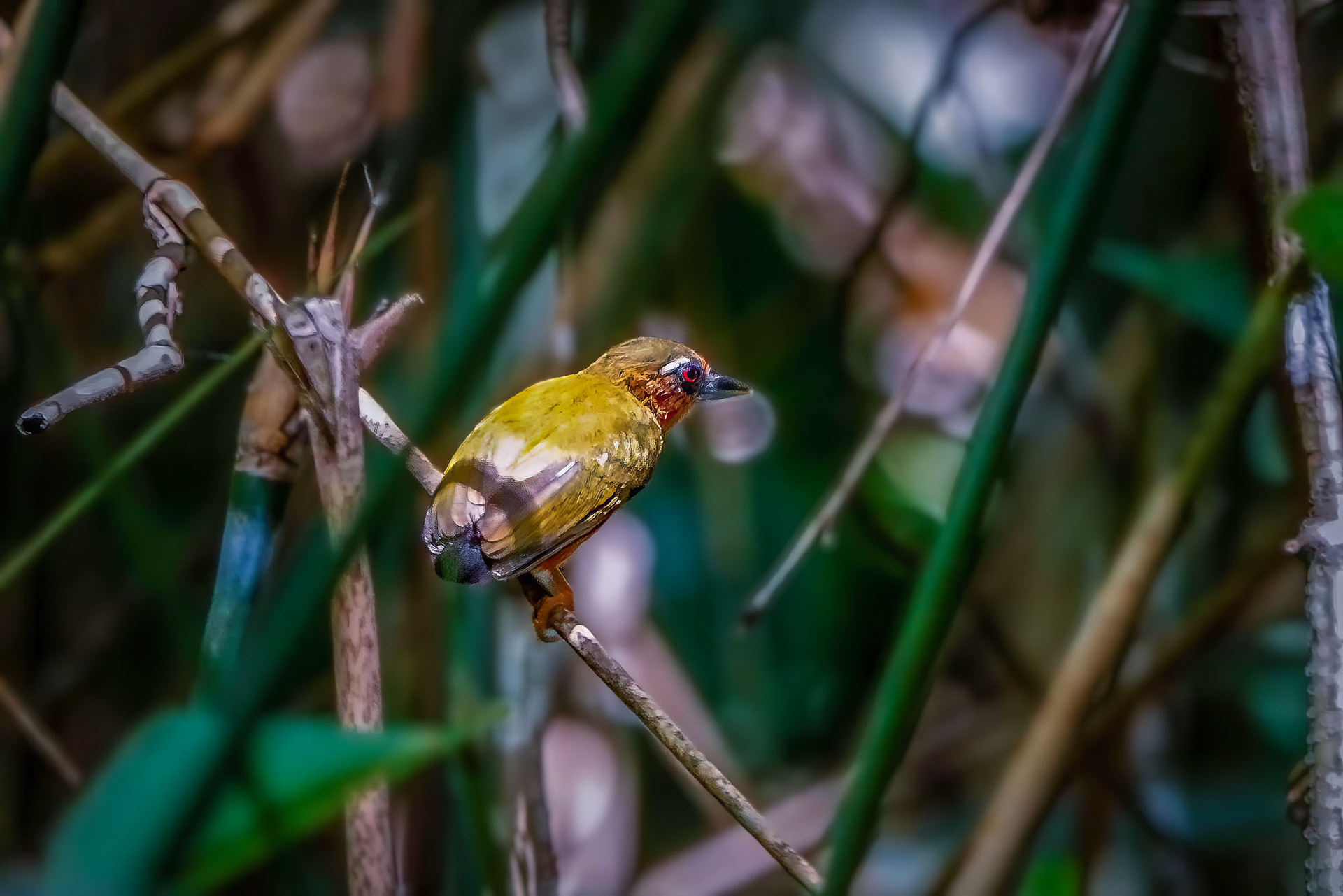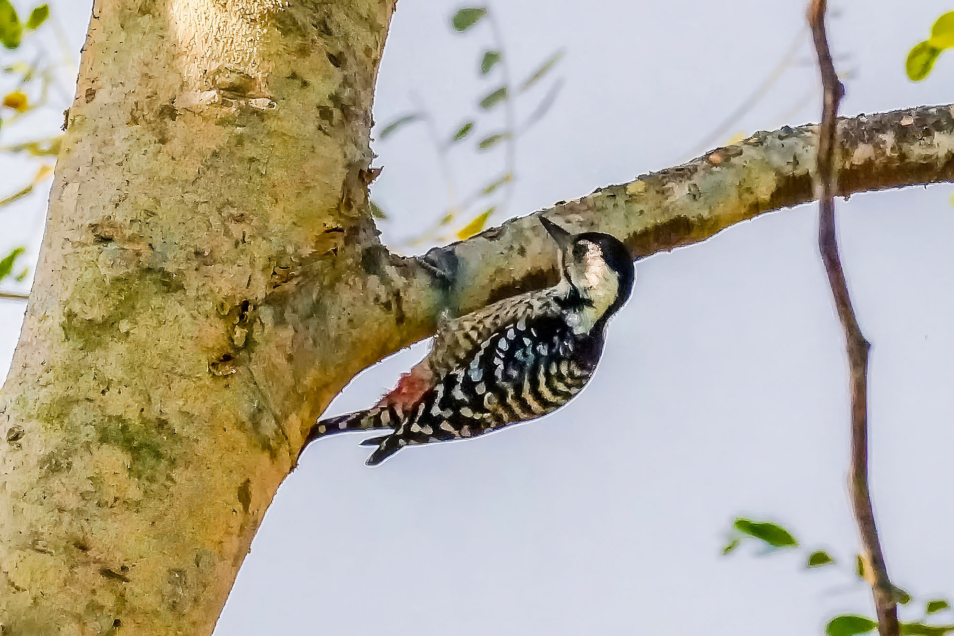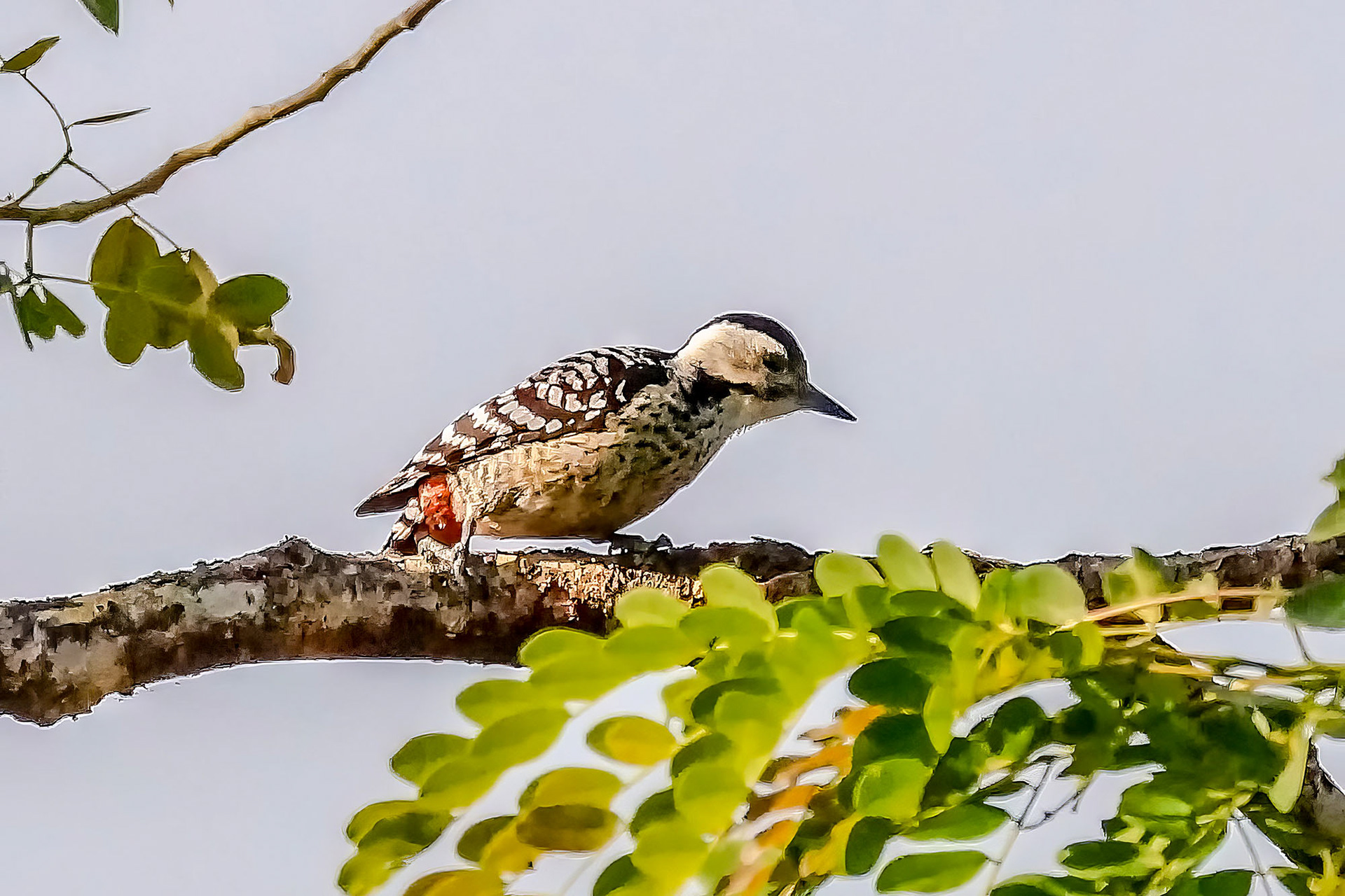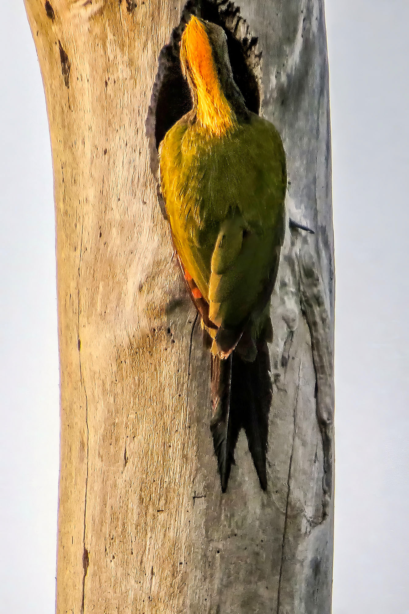 Mit seinem leuchtend grüne Gefieder, das auf der Oberseite in ein sattes Olivgrün übergeht und auf der Unterseite oft einen gelblichen Schimmer zeigt, ist der Burmagrünspecht ein wahrer Hingucker. Besonders auffällig ist der rote Scheitel bei den Männchen, der wie eine königliche Krone wirkt, während die Weibchen oft eine weniger ausgeprägte oder fehlende rote Färbung aufweisen. Der kräftige Schnabel, perfekt angepasst an seine Nahrungssuche, und die dunklen Augen, die wachsam die Umgebung beobachten, vervollständigen das Bild dieses eleganten Vogels.