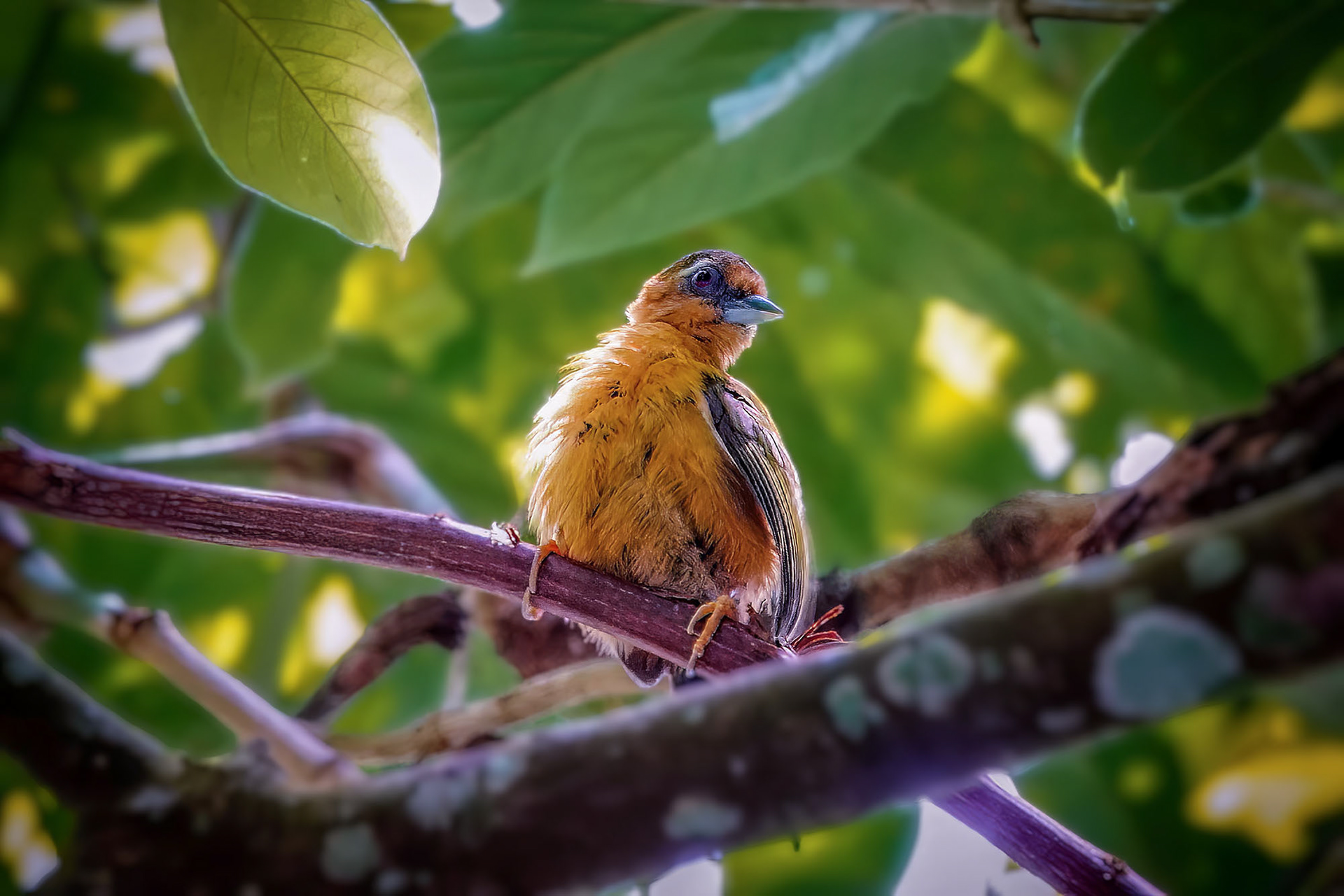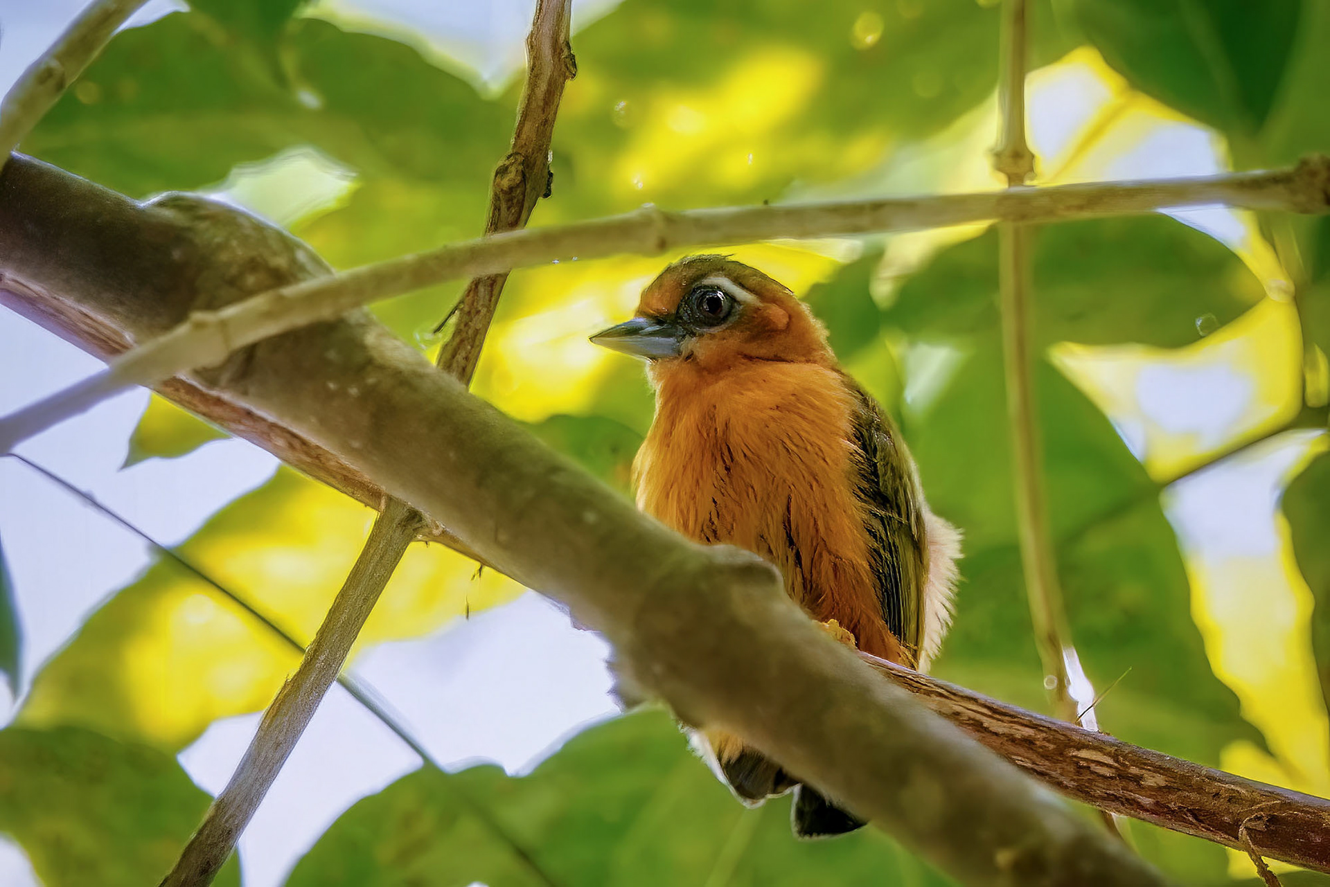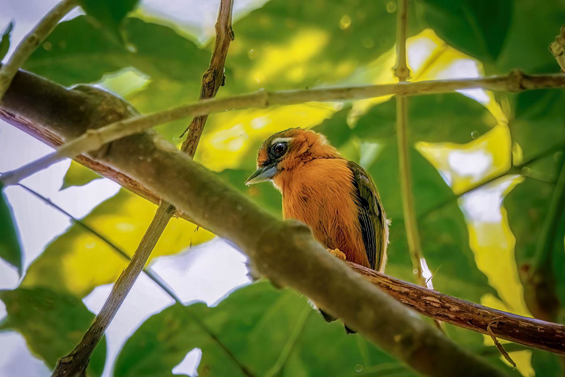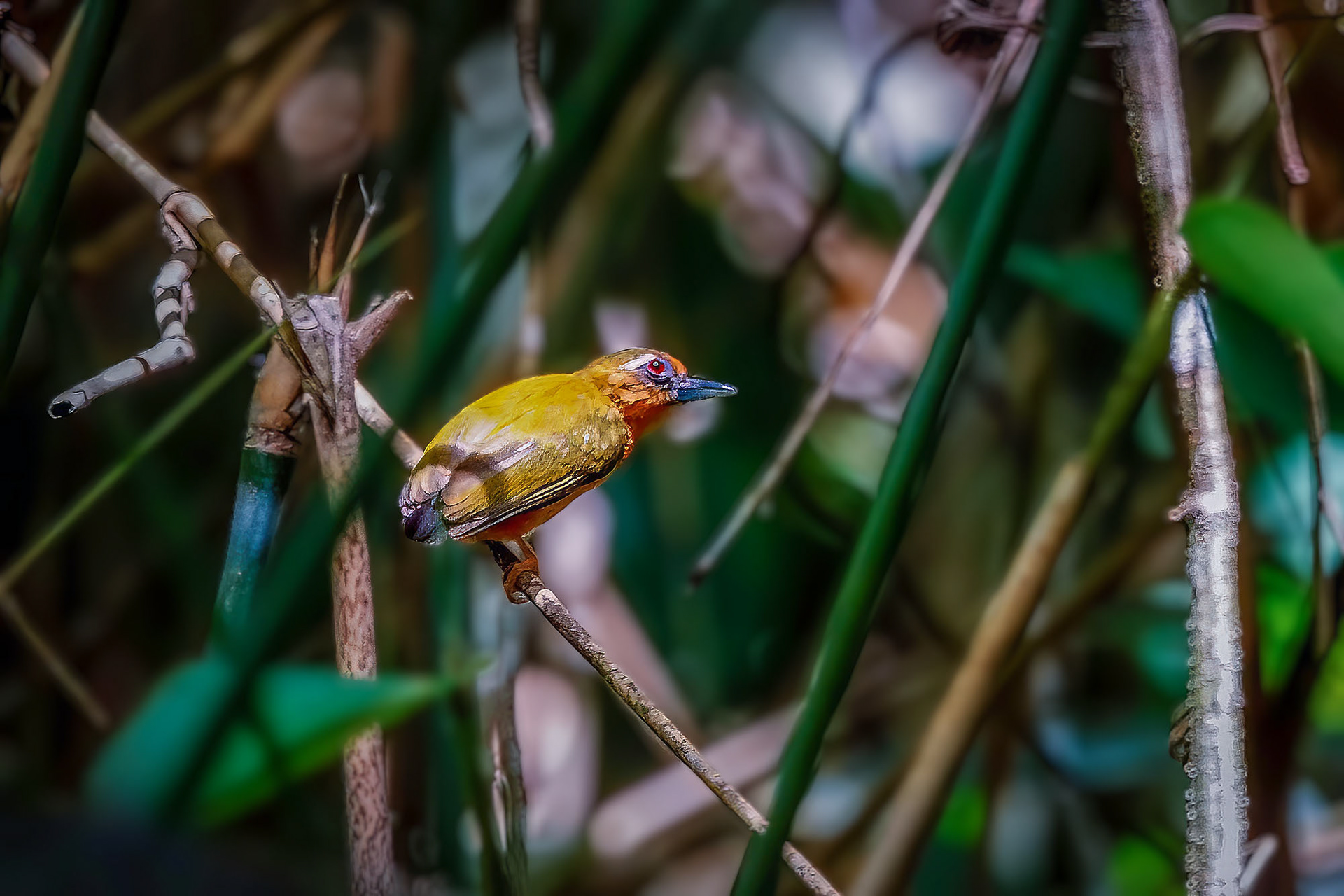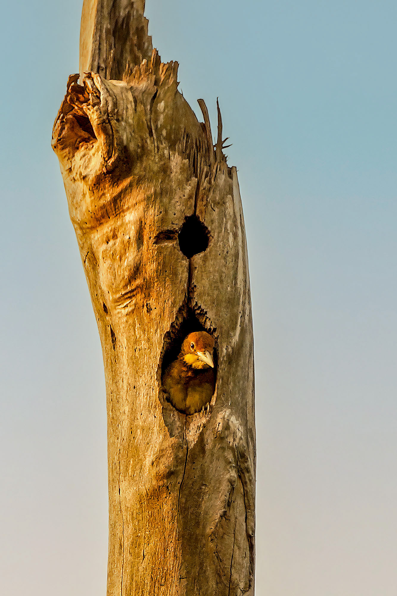 Mit seinem leuchtend grüne Gefieder, das auf der Oberseite in ein sattes Olivgrün übergeht und auf der Unterseite oft einen gelblichen Schimmer zeigt, ist der Burmagrünspecht ein wahrer Hingucker. Besonders auffällig ist der rote Scheitel bei den Männchen, der wie eine königliche Krone wirkt, während die Weibchen oft eine weniger ausgeprägte oder fehlende rote Färbung aufweisen. Der kräftige Schnabel, perfekt angepasst an seine Nahrungssuche, und die dunklen Augen, die wachsam die Umgebung beobachten, vervollständigen das Bild dieses eleganten Vogels.